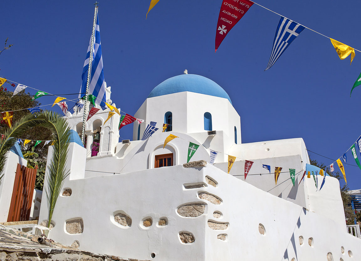 Λευκή εκκλησία, λιτής αρχιτεκτονικής, με μπλε τρούλο και περίτεχνο καμπαναριό που βρίσκεται στο κέντρο της πρωτεύουσας του νησιού το Σταυρό.