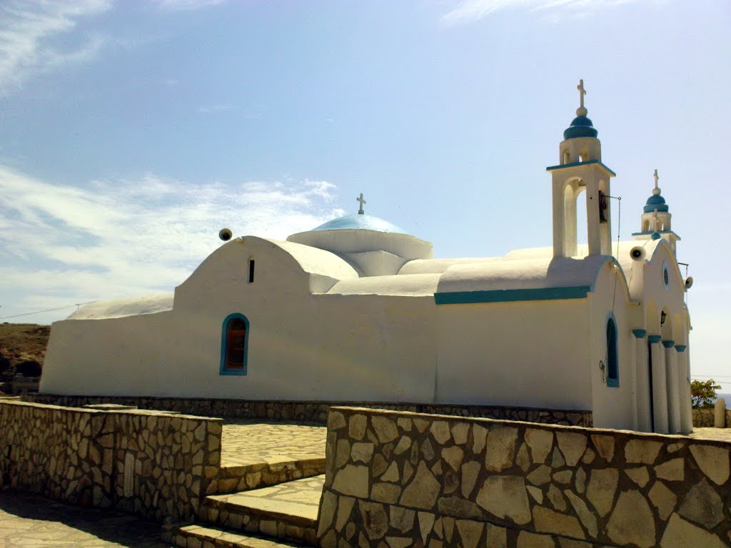 Το αρχικό κτίσμα οικοδομήθηκε τη βυζαντινή εποχή (11ος – 12ος αιώνας) από μοναχούς της Πάτμου. Πήρε το όνομα της από την απεικόνιση της Παναγίας που κρατεί τον Υιό της ως Εσταυρωμένο κι όχι βρέφος. Η εικόνα, που θεωρείται θαυματουργή, στεγάζεται σήμερα στο ναό του Αγίου Ιωάννη του Θεολόγου. Σύμφωνα με την παράδοση, κάθε χρόνο στα εννιάμερα της Παναγίας ανθίζουν οι κρίνοι που πλαισιώνουν την εικόνα και οι οποίοι έχουν ήδη ξεραθεί από την εορτή του Ευαγγελισμού.