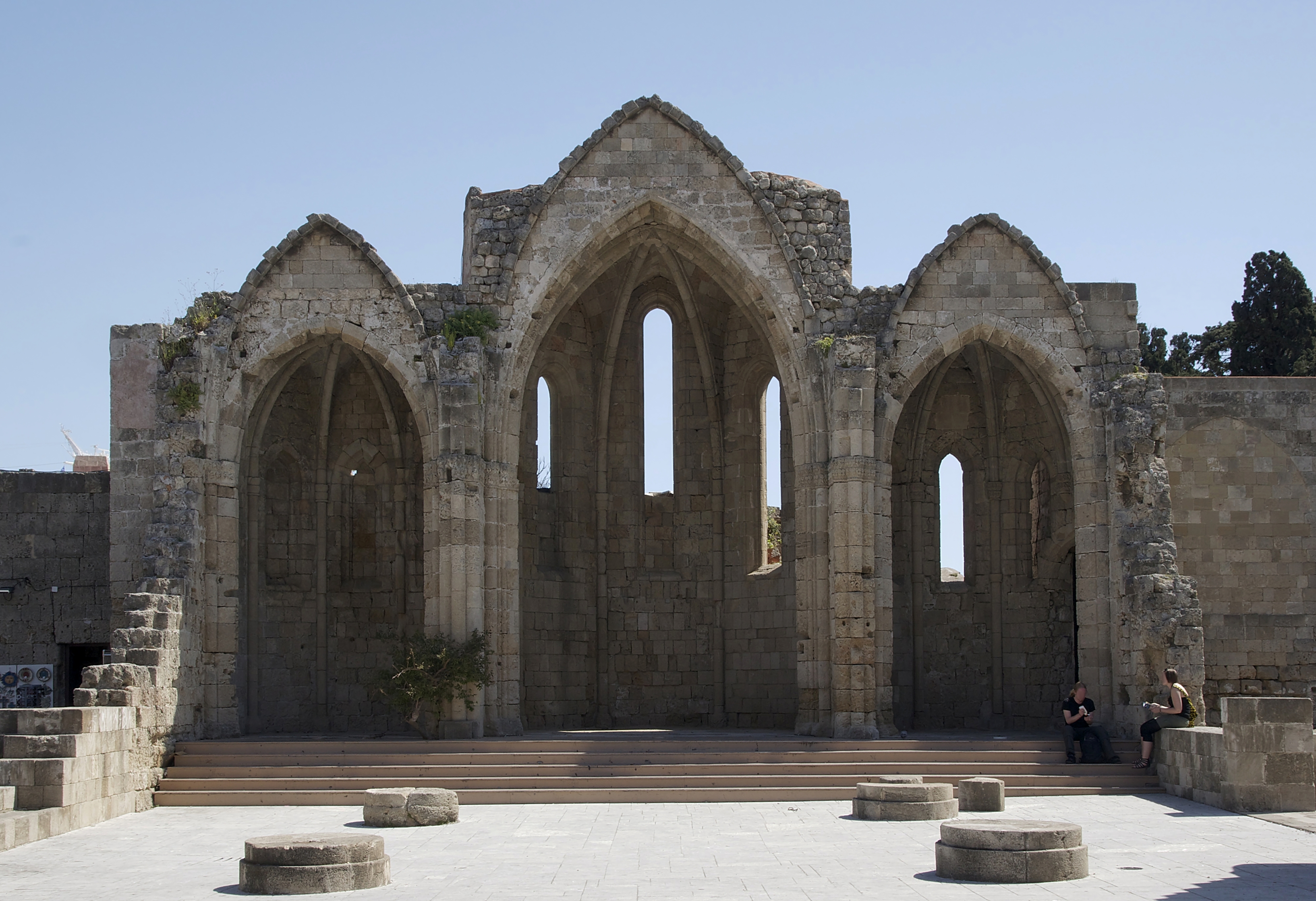Μετά την κατάληψη της Ρόδου από τους Ιωαννίτες ιππότες, η βυζαντινή εκκλησία μετασκευάστηκε και πήρε τη μορφή τρίκλιτης γοτθικής βασιλικής με εγκάρσιο κλίτος. Τα οικόσημα του μεγάλου μαγίστρου Helion de Villeneuve και του πάπα Ιωάννη XXII που σώζονται στο κεντρικό οξυκόρυφο παράθυρο της αψίδας συνηγορούν στη χρονολόγηση της φάσης αυτής μεταξύ των ετών 1319 και 1334. Η ανατολική πλευρά του ναού εφάπτεται με την θαλασσινή οχύρωση και διαμορφώνεται εξωτερικά σε πύργο με ορθογώνιες επάλξεις. Στη δυτική όψη, επάνω από την κεντρική θύρα εισόδου, σώζεται ένα μεγάλων διαστάσεων ορθογώνιο πλαίσιο, το οποίο θα φιλοξενούσε ζωγραφική σύνθεση, χαμένη σήμερα, με θέμα την Παναγία με αγίους και ιππότες. Κατά την περίοδο της Τουρκοκρατίας, ο ναός μετατράπηκε σε μουσουλμανικό τέμενος και ονομάστηκε Εντερούμ Τζαμί. Την ίδια εποχή κτίσθηκε στοά και υψώθηκε μιναρές στη νότια πλευρά, οικοδομικά στοιχεία τα οποία αφαιρέθηκαν κατά τις εργασίες αποκατάστασης του μνημείου που εκτελέστηκαν στην περίοδο της ιταλικής κατοχής του νησιού. Από τον ζωγραφικό διάκοσμο της εκκλησίας διατηρούνται ελάχιστα λείψανα. Αξίζει να αναφερθεί η Παναγία Βρεφοκρατούσα και ζεύγη αγίων στο βορειοδυτικό πεσσό (β΄τέταρτο 14ου αι.) και η μορφή της αγίας Λουκίας στο νότιο τοίχο, έργο πιθανότατα δυτικοευρωπαίου ζωγράφου (β΄μισό 14ου αι.).
