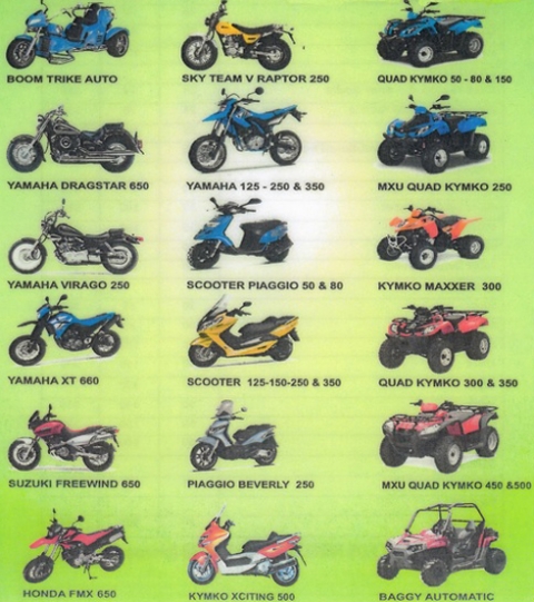 Scooters, Quads (up to 500cc), Trikes, Street- & Enduro-Bikes, Beachbuggies or even Pushbikes.For all Quads and Trikes you only need your car-licence.From 9 a.m. - 10 p.m. you can call us, and our professionals will help you by phone or pick up serviceDeliveries throughout Corfu!!