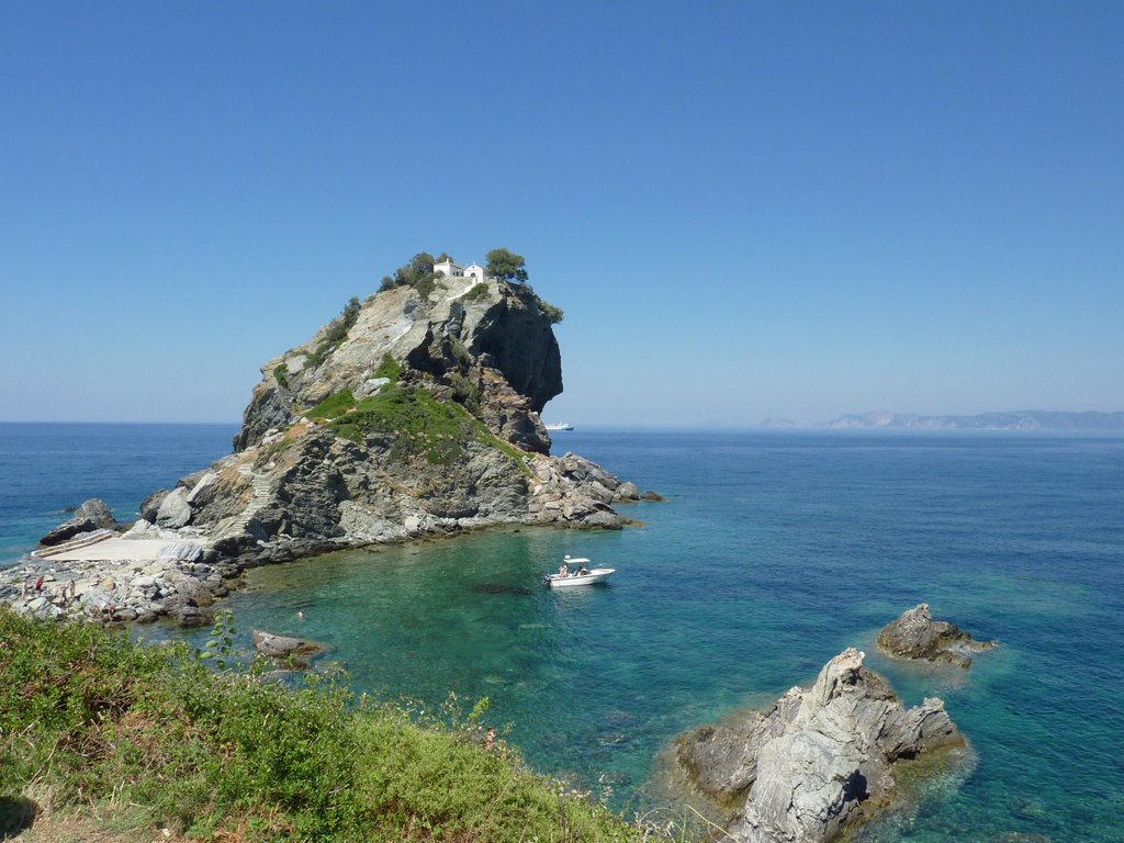 This small chapel is located on the top of a steep cliff, which rises 100 meters from the sea. There are about 200 steps to climb to get to the chapel but the spectacular view of the sea will reward you. The famous wedding scene of Mama Mia! film was filmed here.