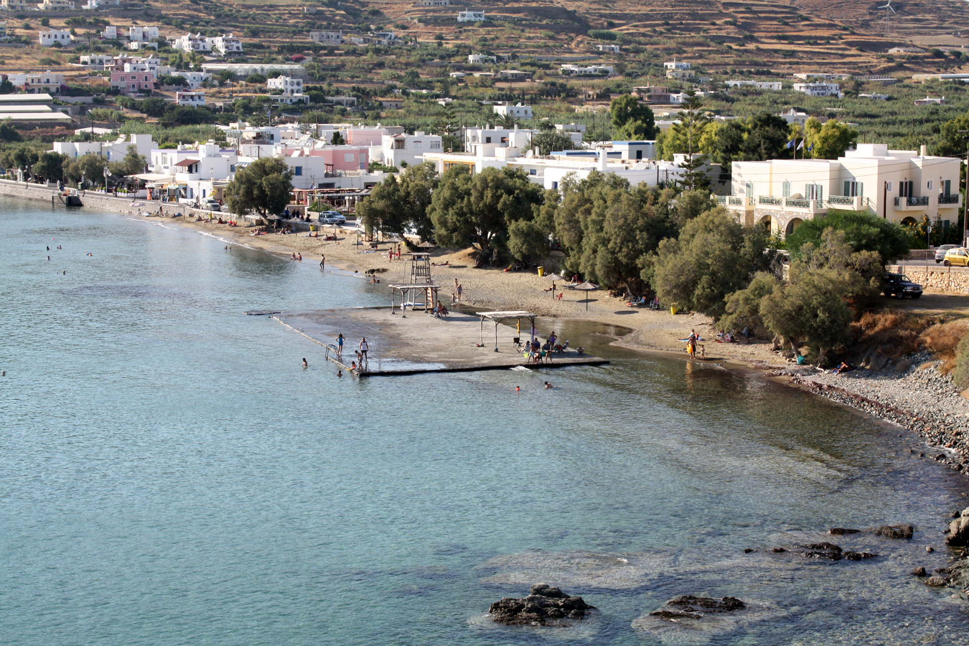 This beach is easily accessible by car or bus. It is 11 km from Ermoupoli, and is protected from the northern winds. It has sand and pebbles, clear water and a rich natural shade from the trees.