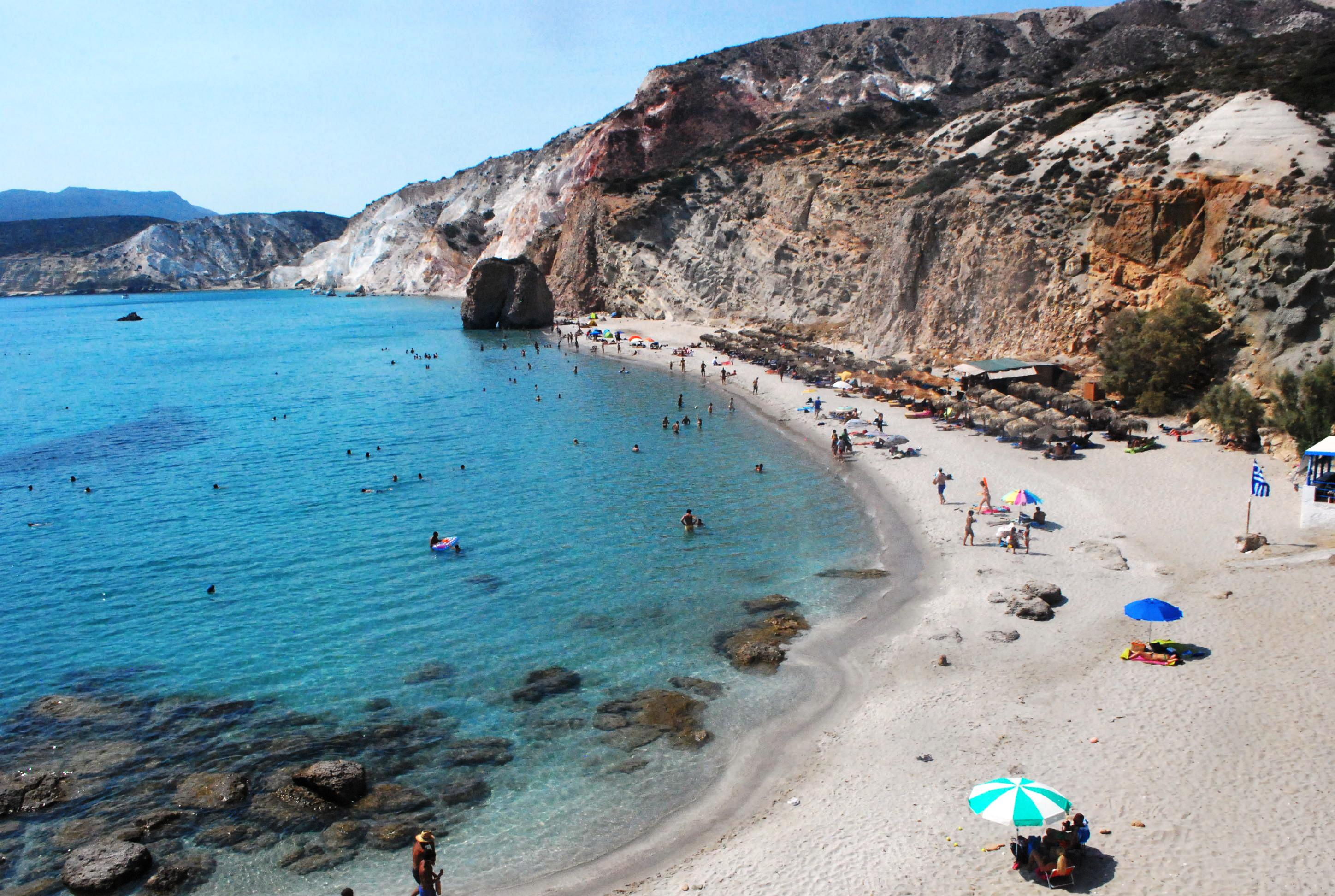 This is a big and organized beach with volcanic cliffs, white sand, gray and white pebbles, turquoise waters, a beach bar and sun loungers with umbrellas. If you want to avoid the crowd, you can walk past Firiplaka Beach and arrive at two secluded beaches where you can enjoy the tranquility and beauty of the place.