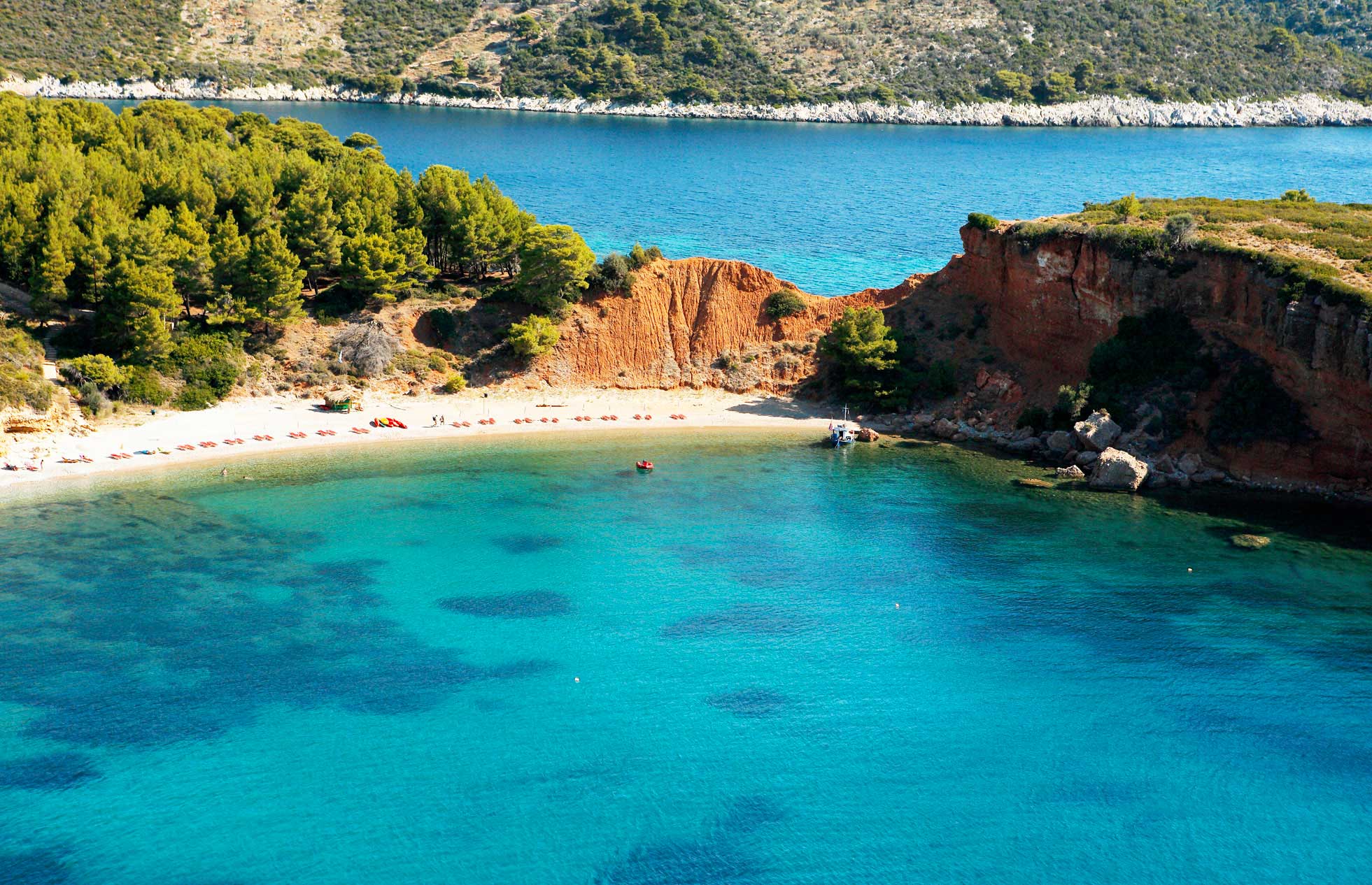 A beach with dozens of shades! Kokkinokastro is considered one of the most spectacular beaches of the island because of its deep blue waters, steep cliffs, yellow sand, colorful stones and green pine trees. As you descend to the beach, you can enjoy the view of the huge red cliffs that continue until deep into the sea forming a small cape. Excavations in the area have shown that in ancient times there was a settlement there, which perhaps justifies the second component "kastro" (meaning “castle” in Greek) in the name.