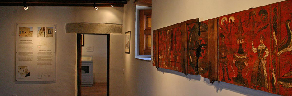 One of the most impressive items in the mansion is "ampataros”, a complex wooden object with double function: storage space and a separation between rooms. It was a key feature of rich houses of the 18th and 19th century. The difficulty of its construction, but also its elaborate decoration made it an object of great value and social status. It depicts people on horses chasing with their dogs, various birds (eagles, peacocks, owls) or the mythical unicorn.