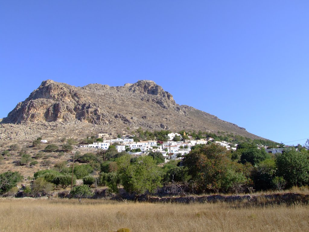 This is a semi ruined castle which was built on top of the mountain of Agios Stefanos at a height of 295 m. Although it is not in good condition, the castle is one of the best preserved castles of Tilos. In the same place there used to be a Hellenistic acropolis, remains of which are visible till nowadays. The castle covers an area of 6,750 m2 and the perimeter of the walls is 390 m. The gate dates back to the Hellenistic period, but was modified by the Knights in order to reduce the height of the opening. Above the entrance the Knights added a parapet with battlements and a small gun-loop. Probably the entire perimeter of the wall was equipped with battlements but we can only see their remnants today. The castle had a good defensive position and was made of stones available in the region. In the interior you can still see the cisterns and the Church of Taxiarches which have been preserved till nowadays. The castle overlooks the bays of Agios Antonis and Eristos and the island of Nissiros.