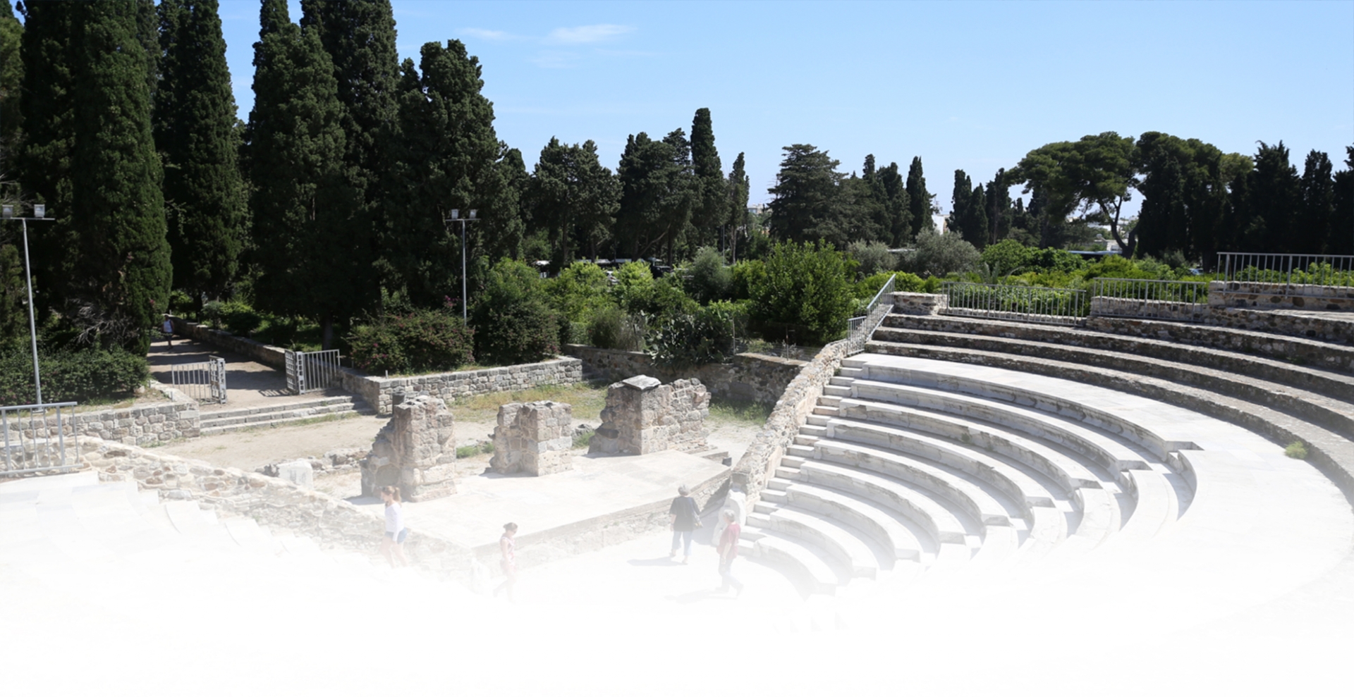 The building could house up to 750 people. It had fourteen rows of marble seats, nine of which have been restored. The stage is an irregular pentagon and consists of two parts, the foreground and background, which are connected through three entrances. On both sides of the stage there were two doors leading to the aisles. In the arcades of the Odeon there are marble statues such as the statue of Hippocrates which is now exhibited in the Archaeological Museum of Kos.
