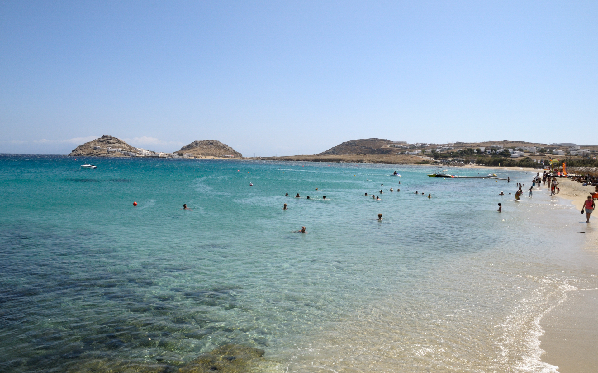 Η παραλία που προνομιακά βλέπει απέναντι την Δήλο, το ακρωτήρι της Αλεόμαντρας και το κανάλι μεταξύ Μυκόνου και Δήλου. Είναι επίσης η παραλία με το γνωστό πανηγύρι του Άη Γιαννιού, στο τέλος του Σεπτέμβρη. Η παραλία είναι αμμουδερή και συνιστάται για αυτούς που θέλουν ηρεμία και χαλάρωση στο μπάνιο τους. Είναι οργανωμένη, δεν υπάρχουν όμως θαλάσσια σπορ.