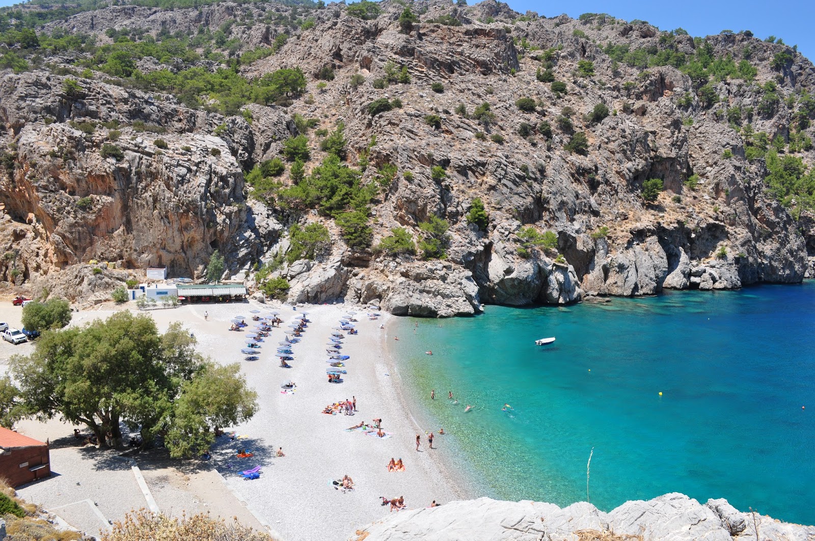 Παραλία με κρυστάλλινα βαθιά νερά, που συνδυάζει άμμο και βότσαλο και αγκαλιάζεται από κατάφυτα βουνά. Ένα μέρος της είναι οργανωμένο με ξαπλώστρες και ομπρέλες, ενώ υπάρχει και ένα ταβερνάκι. Απέχει 5χλμ. από το Απέρι.