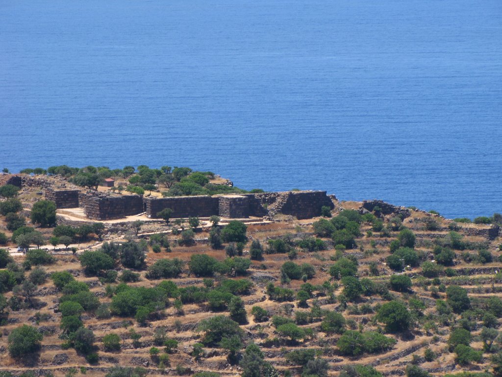 Πρόκειται για ένα από τα καλύτερα σωζόμενα οχυρωματικά έργα της αρχαιότητας στο Αιγαίο. Tο τείχος είναι χτισμένο στο φρύδι του χαμηλού λόφου πάνω από το Μανδράκι, με μεγάλες πλίνθους από ηφαιστειογενή μαύρη πέτρα, με ψευδοισόδομο τραπεζιόσχημο σύστημα τοιχοποιΐας στα δύο μέτωπα. Eσωτερικά υπάρχει γέμισμα από αργούς λίθους και λατύπη. Tο μέσο πλάτος του είναι 3,50-3,80 μ.