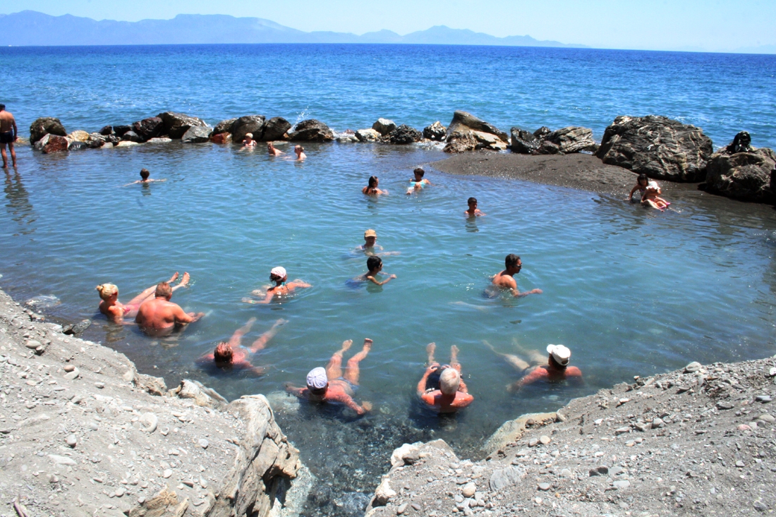 Η εμπειρία ανεκτίμητη, ένα φυσικό σπά! Στο μπροστινό μέρος της παραλίας έχει δημιουργηθεί μια μικρή λίμνη που διαχωρίζεται από την υπόλοιπη παραλία με βράχια που επιτρέπουν στο θαλασσινό νερό να εισέρχεται και να δροσίζει τα καυτά νερά. Η παραλία αυτή είναι κατάλληλη για όλες τις ηλικίες και για όλες τις εποχές. Μπορείτε να επισκεφθείτε τα Θερμά είτε με το λεωφορείο, είτε με οποιοδήποτε ιδιωτικό μεταφορικό μέσο.