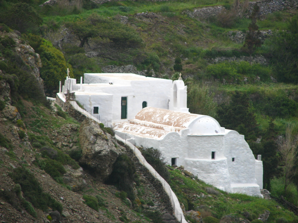 From the terrace of the courtyard you can enjoy view of the serene landscape. You can reach this place by car or by an old trail that starts from the church and leads to Katapola.