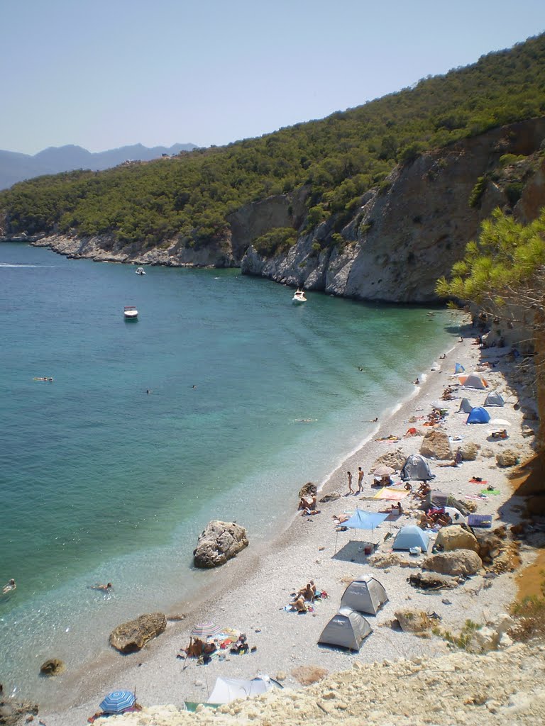 This is a beach with small pebbles and crystal clear waters. However, due to the steep cliffs in the area, it is not easily accessible.