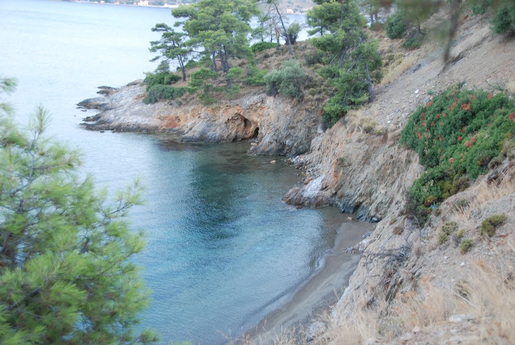 Here you will find three consecutive bays and a sandy beach with pine trees. At the second bay there is a café and a restaurant.