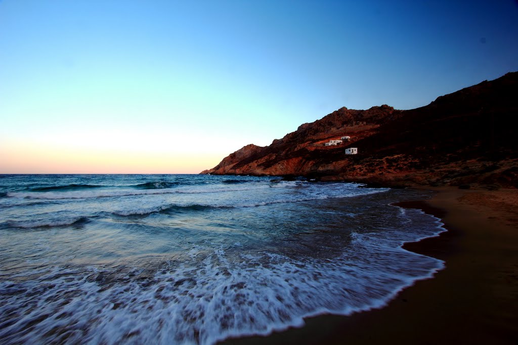 This is one of the most beautiful beaches of the Cyclades. You can go scuba diving or just enjoy the warmth of the sun under your umbrella. The little island opposite the beach is called Vous.