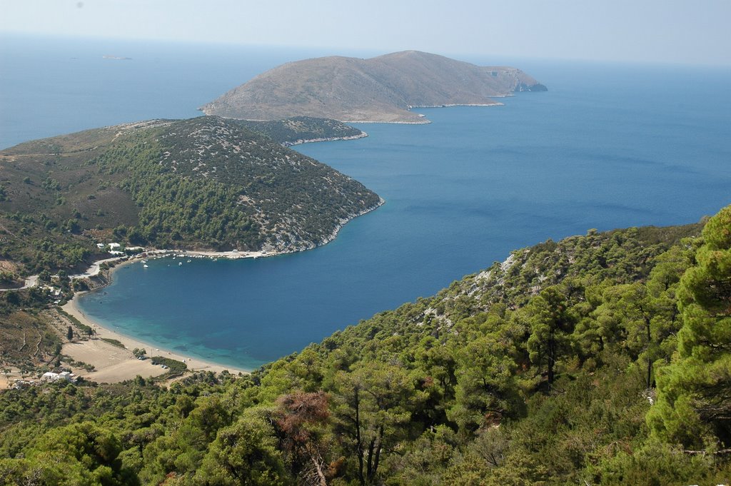 This is a beautiful beach in the heart of a sheltered bay with great views. It has fine sand, clear water and pine trees.