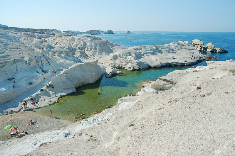 Located in the Northern coast of Milos, this is the most well-known beach of the island. Its distinctive landscape of white rocks creates the illusion of a lunar landscape. The place is ideal for those who love diving. The beach is not organized so it is useful to equip oneself with the necessities.