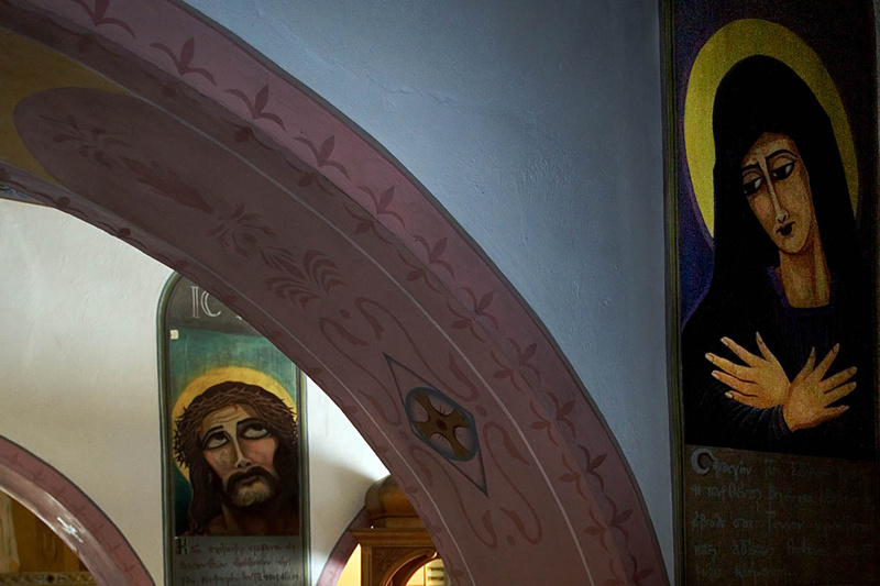 North of Partheni you will find a vaulted church built in the 18th century. The walls are decorated with unique frescoes of non-Byzantine style. During the years of the dictatorship, the church was ruined until a group of political prisoners (Manolis Glezos and painters Kyr. Tsakiris, Ant. Karagiannis and T. Tzaneteas) decided to repair it. The three exiled painters depicted the history of the island on the interior walls, using prisoners, women of Leros and gendarmes as their models. Since the beginning of the project in 1969 and until its completion eight months later, the islanders remained very supportive. However during the political changeover, people from conservative or religious groups, painted the wall white. Poet Yannis Ritsos was also one of the exiles on the island. The place inspired him to write "18 Little Songs of the Bitter Homeland" which was later set to music by Mikis Theodorakis.